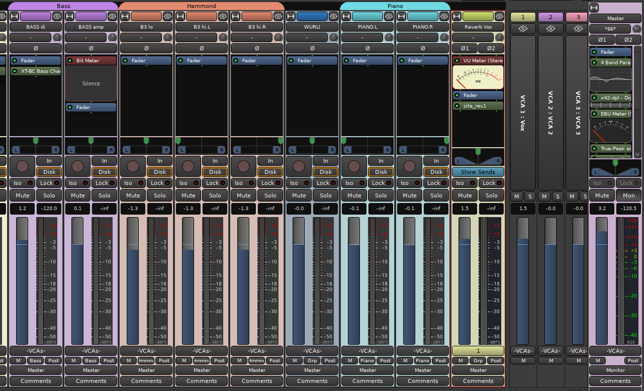 I do like at @tanjeffmoos mockup, but the current state of coloring the whole strip incl faceplace of the fader and meter is not helpful and introduces visual clutter in my opinion. Also the master-bus be exempt but VCAs should also have an outline (like tracks). The faders should not default to blue but the fader/meter area get colored depending on track type (again). For those who cannot compile from git, the current state looks like : |