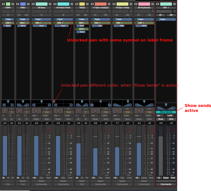 Thanks @ovenwerks. I didn't know this option. It's quite hidden. So in that case it would be nice to have possibility to unlink pan of send directly from pan control somehow, when sends of bus are shown :-) But it's task for some UX designer ... And when it's unlinked, it's missing small pan control right next to send label/panel, similar as is used in foldback bus, and also some visual information, that pan is unlinked ... Anyhow, I can live with it as is. |