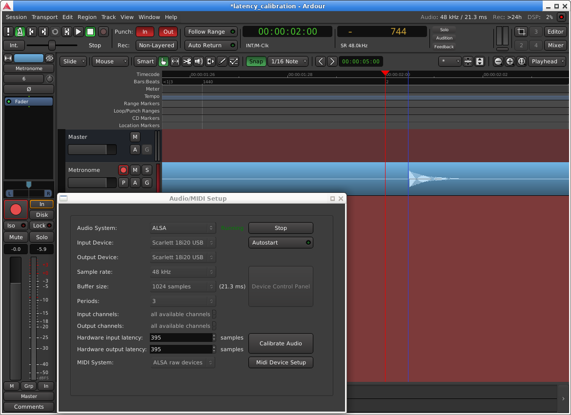 | Steps To Reproduce | 1. Launch Ardour and open (or create) a session. 2. When “Audio/MIDI Setup” window appears, click on “Calibrate Audio”. 3. Follow instructions, and when it is calibrated, click on “Use results”. Do not disconnect the cable used for calibration. 4. Go to “Window” > “Audio Connections”, select “Ardour Misc” tab on “Sources” and “Hardware” tab on “Destinations”, and connect “Click Out” (L) to the hardware output where one edge of the cable used for calibration was connected. NOTE: it should be a hardware output not used as output for the “Master” bus. 5. Add an audio track, and feed its input with the hardware input where the other edge of the cable used for calibration was connected. 6. Arm the track, and ensure metronome is enabled, toggle on the record button and click the play button. 7. Stop after several beats, and see how the metronome click wave is perfectly synchronized with the beat lines. 8. Go to “Window” > “Audio/MIDI Setup” > “Midi Device Setup” and calibrate any MIDI device. 9. Record again the metronome click as done in step 6. Expected: The metronome click wave continues being perfectly synchronized with the beat lines in the second take. Actually: The metronome click is not correctly synchronized with the beat lines in the second take, making audio calibration is required again. | ||||