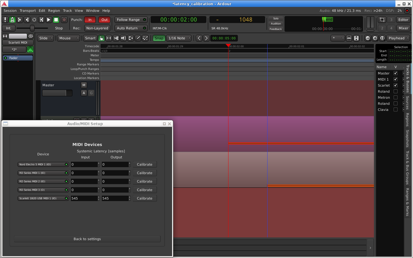 | Description | After calibrating audio, if the cable used for calibration remains connected, Ardour’s metronome click is routed through that cable, and an audio track’s input is feed with the hardware input where that cable is connected, once several beats are recorded for that audio track, it will capture the metronome click wave perfectly synchronized with every beat line. However, that is not the case for a MIDI track. | ||||