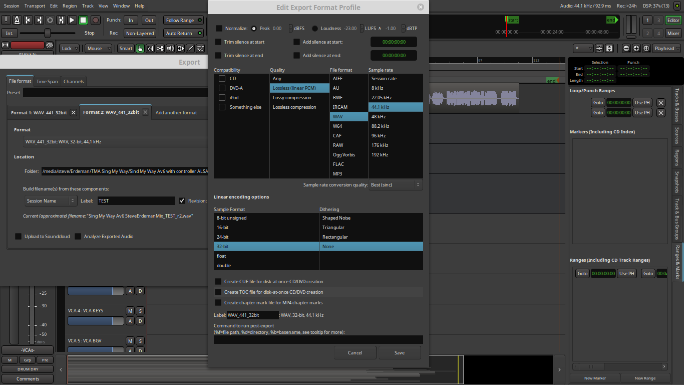 | Description | When exporting a mixdown to an audio file, I notice that trying to export a WAV 44.1, 32but (non-float) file does not work correctly. When creating a new export profile, hitting SAVE populates the log with this kind of line: 2020-04-28T23:27:30 [ERROR]: XML error: failed to load external entity "/home/steve/.config/ardour6/export/BWAV 32float Export (copy).format" Continuing on with setting up the export settings, the popup box does some weird things in the section regarding dither type. (ref. the two screen captures please). After first selected 32bit, all the dither types seem to be available (in white text). But if you click to 16bit, then back to 32bit, all the dither types, except NONE, turn RED. The resulting export more often than not turns out to be 32bit float. I have not figured out how to, with confidence, make a non-float 32bit file. | ||||