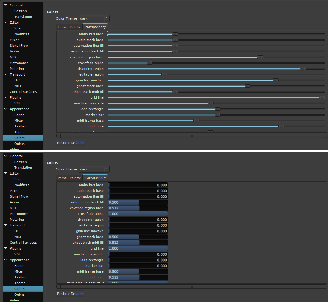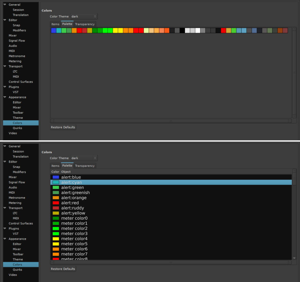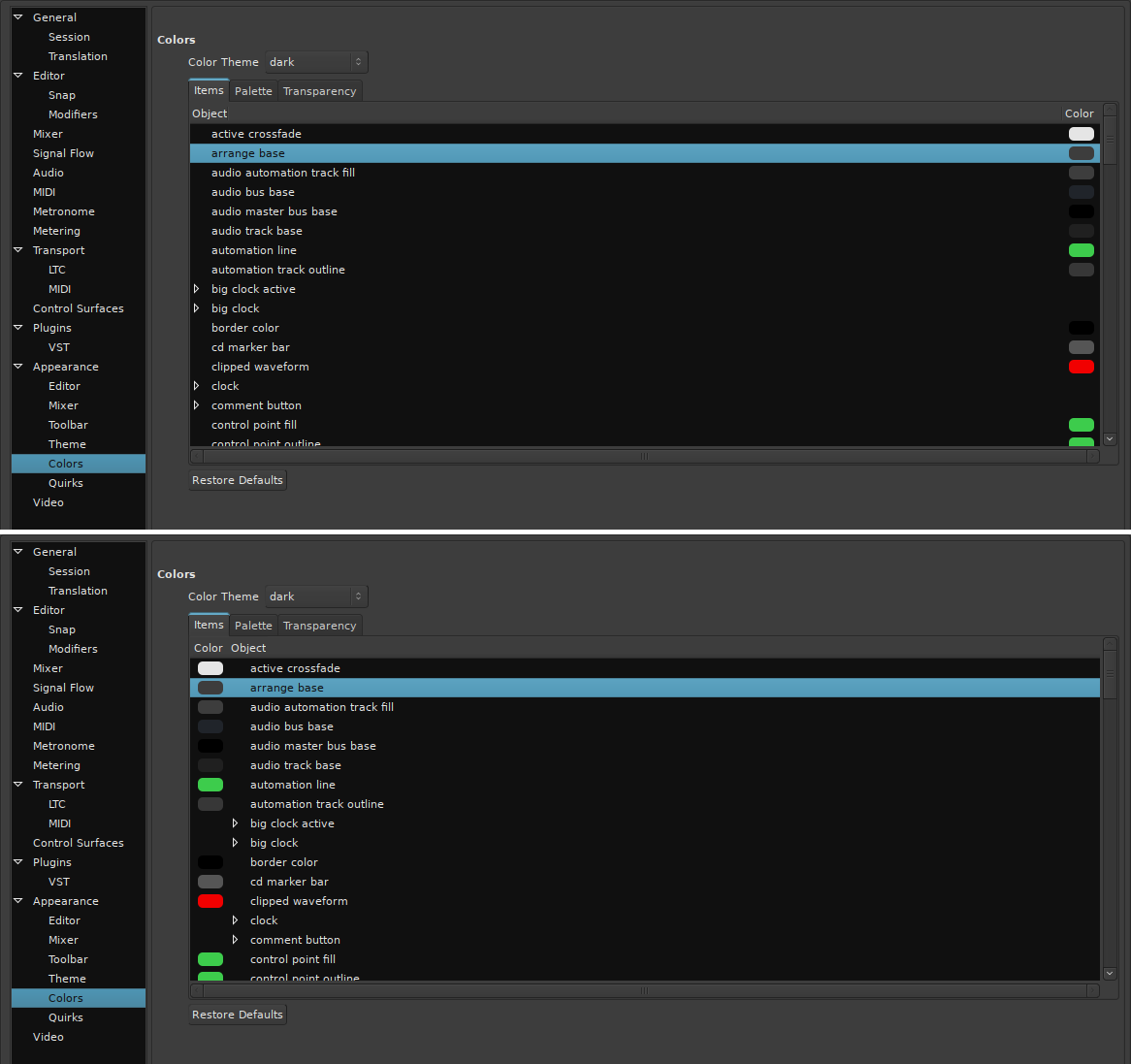 | Description | Suggestion 1 - Move Colors column to the left of text When using the 'Items' tab of the Colors preference the colour boxes are alligned to the far right and are difficult to visually line up with the text without selecting a row to highlight it. Moving the 'Color' column to the left would make it easier to match up the colours with the menu item. Suggestion 2 - List palette options in line with 'Items' tab for consistency and ease of discovery Currently you have to hover over the coloured boxes to see what each colour is set to by default. Listing them out in line with the 'Items' tab would be more consistent and easier to figure out. Suggestion 3 - Use plugin sliders in transparency tab The transparency tab uses GTK sliders. There are two problems with this. Their throw is long and there is no value read out when you adjust them, making it difficult to visually interpret them and gauge changes. Using the sliders provided by generic plugins would solve both of these problems. | ||||