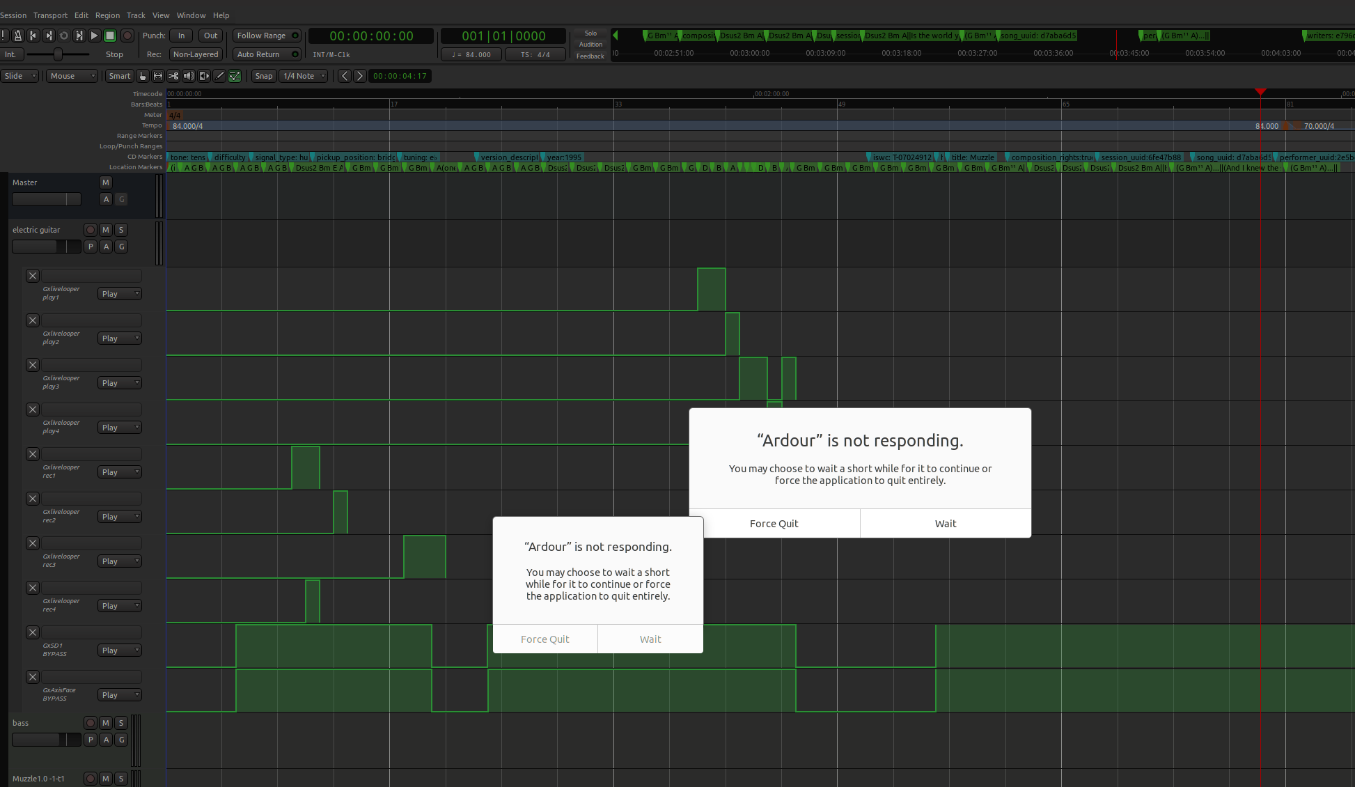 | Description | Ardour sometimes locks up when loading a session. Unfortunately this issue is intermittent and I don't have any further information about when it happens and when it doesn't. I took a screenshot of the failure. Running in "--gdb" mode shows nothing interesting in the terminal window for debugging purposes. fluidsynth: warning: No preset found on channel 0 [bank=128 prog=0] fluidsynth: warning: No preset found on channel 0 [bank=0 prog=33] fluidsynth: warning: No preset found on channel 0 [bank=0 prog=33] fluidsynth: warning: No preset found on channel 9 [bank=128 prog=0] fluidsynth: warning: No preset found on channel 0 [bank=128 prog=0] fluidsynth: warning: No preset found on channel 9 [bank=128 prog=0] fluidsynth: warning: No preset found on channel 0 [bank=128 prog=0] fluidsynth: warning: No preset found on channel 9 [bank=128 prog=0] fluidsynth: warning: No preset found on channel 0 [bank=128 prog=0] fluidsynth: warning: No preset found on channel 9 [bank=128 prog=0] locate took 9979 usecs for 9 tracks = 1109 per track Reading player:Smashing_Pumpkins_-_Muzzle-t1-1-t2 took 5292 microseconds, final size = 5390 Reading player:Smashing_Pumpkins_-_Muzzle-t2-1-t3 took 3862 microseconds, final size = 5530 Reading player:Smashing_Pumpkins_-_Muzzle-t3-1-t4 took 14083 microseconds, final size = 13152 [New Thread 0x7fff89551700 (LWP 63366)] Reading player:Smashing_Pumpkins_-_Muzzle-t4-1-t5 took 6573 microseconds, final size = 6621 Reading player:Muzzle1.0 -1-t1 took 1496 microseconds, final size = 2506 Reading player:Muzzle_montesavp-1-t1 took 2135 microseconds, final size = 2613 Reading bass took 260 microseconds, final size = 204 locate took 1268 usecs for 9 tracks = 141 per track [Thread 0x7fffd59f7700 (LWP 63337) exited] | ||||