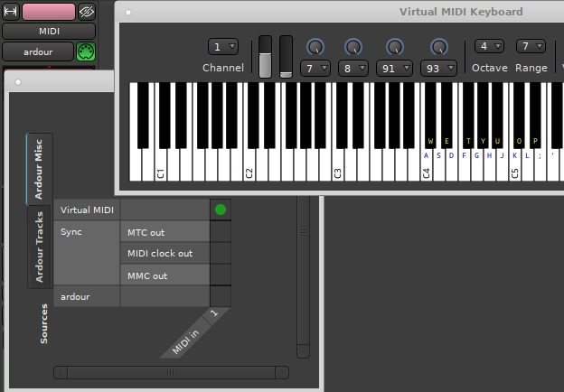Could you elaborate? What do you mean with "piano roll", how does this fail? It's already possible to record the Virtual Keyboard directly on a MIDI track. The Virtual Keyboard offers a connectable port, and you can connect it like the external jack-keyboard or vmpk to any track in Ardour. Regardless of the backend. Menu > Window > Virtual Keyboard and then on the MIDI track, connect its port... |