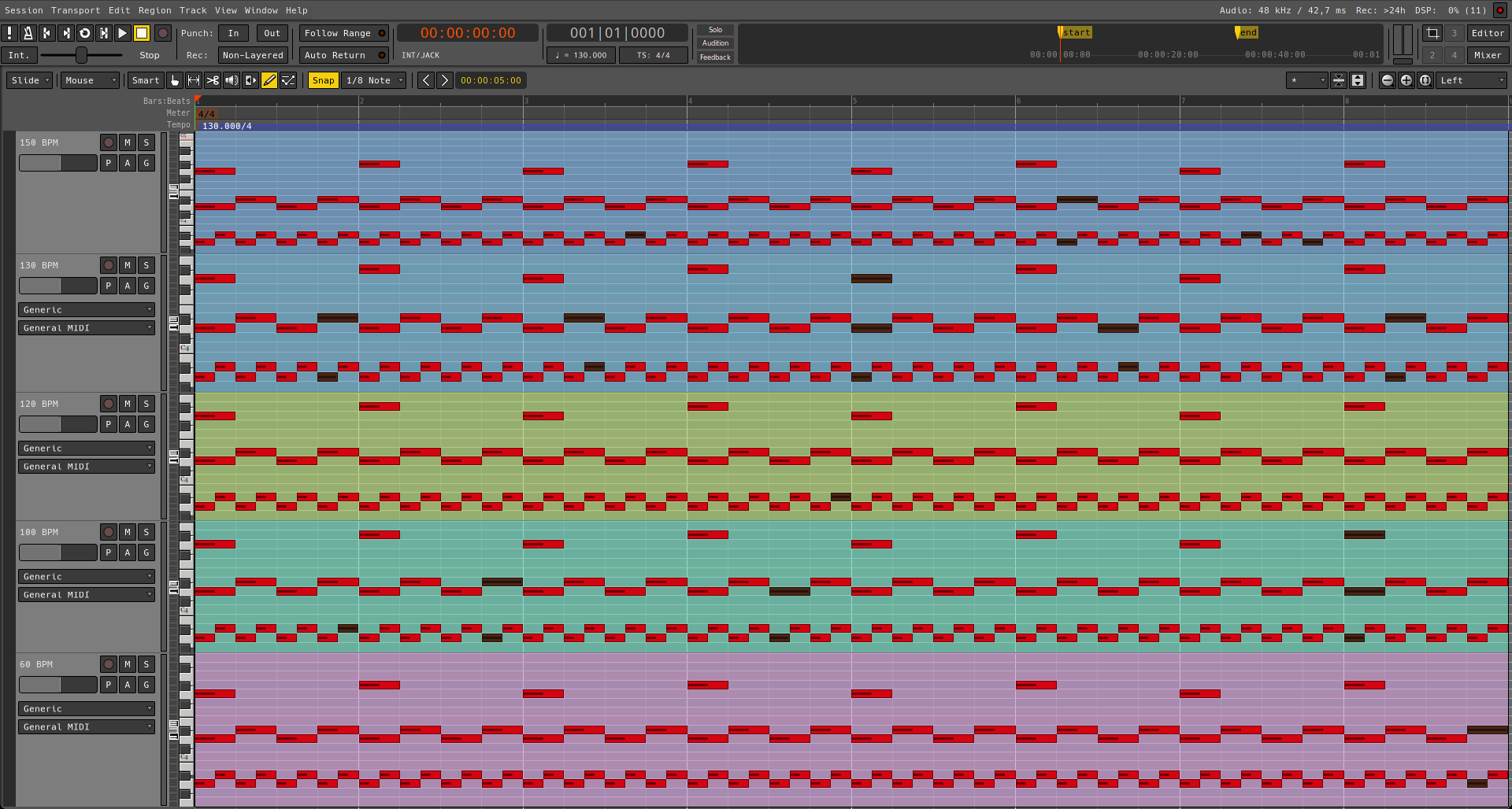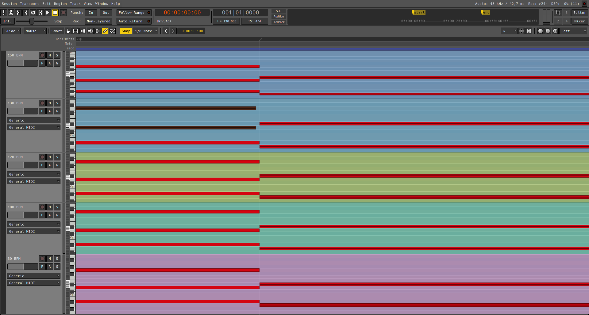 | Additional Information | Ardour compiled locally, commit 378a0af waf configure -j 6 -p --optimize --cxx11 waf build -j 4 -p JackAudio sample rate is 48 kHz (probably has to do with it as Ardour doesn't use "absolute time") Haven't tested with a different sample rate because it's really annoying to go through the steps to reproduce again and restarting jack server and whatnot, pulseaudio. (why the issue occurs?) My intuition as a humble programming hobbyist says that there is a math.ceil() missing somewhere on the code that determines the midi note ending while on snap mode to the grid, causing this ( 1/sample_rate ? ) misalignment on the note endings. It's somewhat very clear that when you analyze the image the issue is relative to the bpm of the session, as seen on the 120 and 60 bpm tracks, the position where the issue occurs doubles when halving the bpm, and with some bpm like 130 it occurs more often as it's a not-as-whole-number-as-120 internally. My intuition says that this issue is present on a lot of possible note start positions but only shows up when the grid happens to match where the issue is happening, hence why on a more "broken" bpm like 150 it doesn't really follow an visible pattern with few information. On the 130 bpm track, the issue is periodic and alternating as well as it depends on the note size (?), the 1/4 black note goes up up, down down while the 1/8 notes goes down up down up. | ||||
