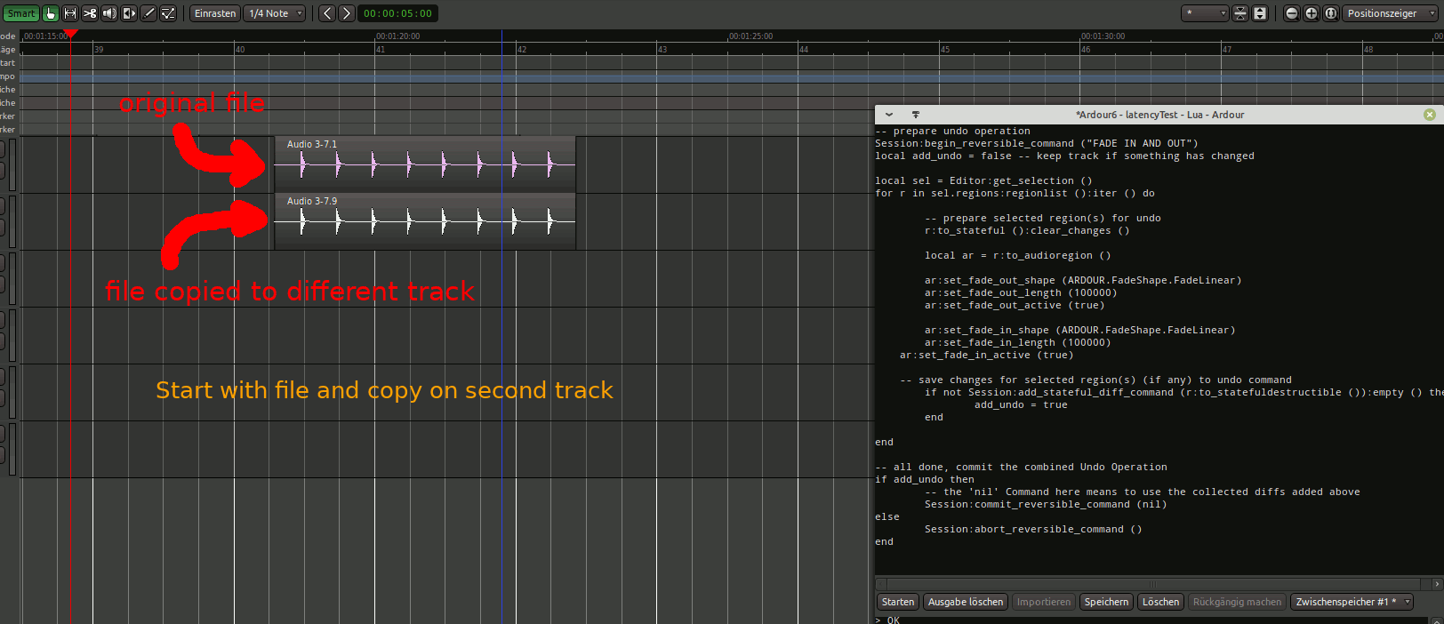 DescriptionWhen Lua scripting fade ins and outs for audio regions, the fade outs (in many cases) do not register an undo correctly (as do the fade ins) and therefore cannot be undone! I did a lot of test rounds with virgin Ardour6 config folders, old and freshly created projects… It is 100% reproducible on my machine - try this basic example script: