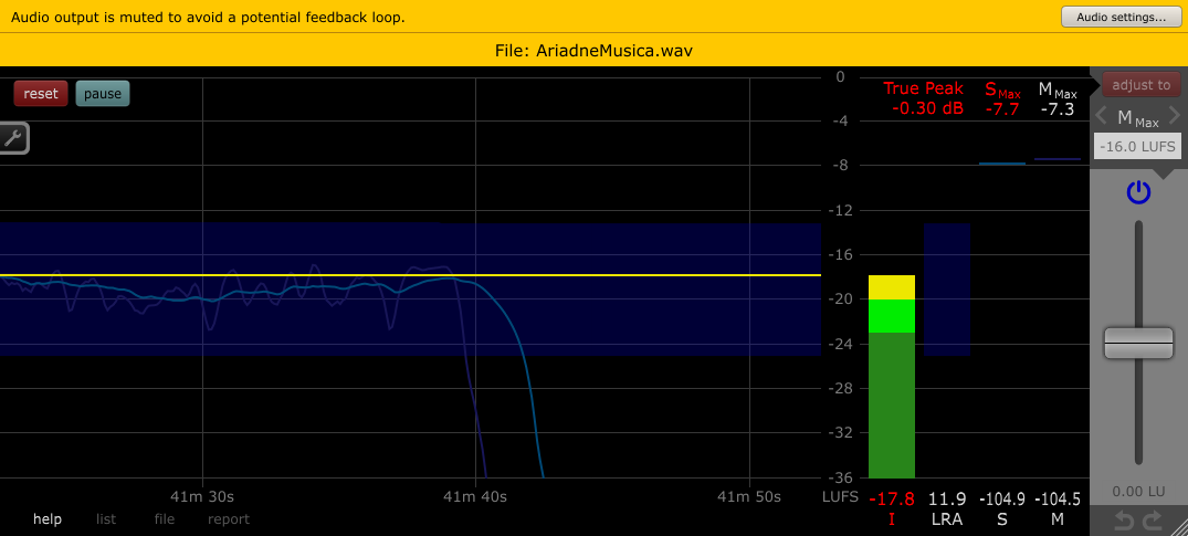 Great work for 6.2-91-g02a31b97b2. I think I feel less strongly about the text appearing every time now, especially with the tweak of the layout. It definitely feels more natural now. I love the session menu item and the loudness assistant range context menu is really useful for quick partial analysis. So, the one remaining issue is that of presets and streaming standards. There are various use-case scenarios that seem to require an alternative solution. For example, a user has mixed/mastered a pop song into a peak limiter. When they use LAN, it reports -1 dBTP / -18 LUFS integrated. If they wish to conform to, say, Apple Music, they have already reached the peak target so LAN would offer no extra gain. Enabling only the integrated would push the true peaks to +1 dBTP given the placement of the gain control in the chain. For this, and plenty of other cases, the a-amplifier prototype seems like a better solution, or indeed adding it manually after analysis. Take the EBU R128 standard...there is never a case AFAIK when the user would be ok with settling for -1 dBTP / -25 LUFS int. They would always want to conform exactly (or within the ± bounds) to -1 dBTP / -23 int. I'm realizing that for music not close to 0 dB peaks (like my harpsichord recordings) I won't have any issues. For pop, rock, wide dynamic classical and particularly for situations where conforming exactly is part of the workflow i.e. broadcast, the normalizer part seems to need an alternative solution. iZotope RX builds in a TP limiter for when files need to be conformed to simultaneous loudness and true peak values. While this isn't desirable for an Ardour session, an existing limiter on the masterbus does cause problems for LAN even though it is trying to be part of the mastering solution ;) |