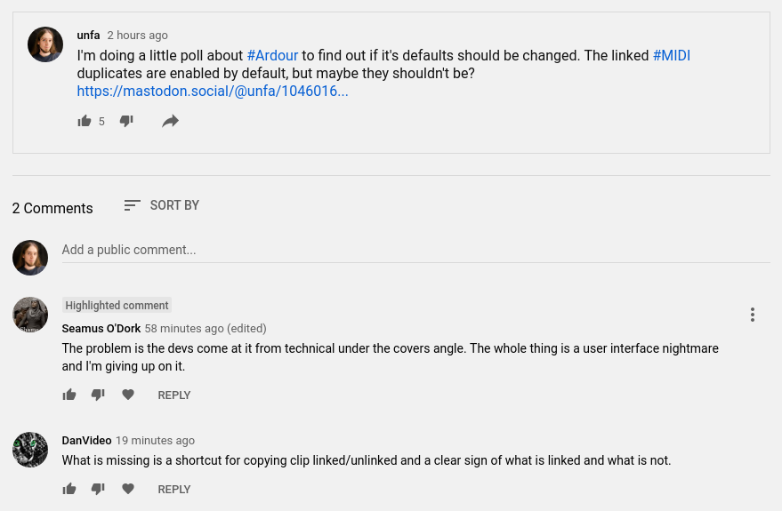 I think it'd be great to have an option to choose linked or non-linked duplicates individually, though I think without visual indication it's not going to be of much use. More comments on YouTube under my post here: https://www.youtube.com/post/Ugy4h5cADm9YscUmqER4AaABCQ?lc=UgwCOObliRU8LgIeWpN4AaABAg The relevant ones so far: > [ Iurie ] (Geonkick developer) > 6 hours ago (edited) > Linked for me creates only problem most of the time. It should be unlinked and an option to select and link if there is a need, copy as linked etc. > [ DanVideo ] > 1 day ago > What is missing is a shortcut for copying clip linked/unlinked and a clear sign of what is linked and what is not. > [ QuotePilgrim ] > 22 hours ago (edited) > You shouldn't be asking if people are using the feature, that's not going to answer your real question, which is if they think it should be enabled by default. > > The way you phrased your question, people who use the feature but don't think it should be enabled by default are forced to answer yes. If there are many such people, you'll come to the conclusion that the feature should be enabled by default, even though that wouldn't be the case. > [ Tim Hawthorn ] (an Ardour beginner) > 22 hours ago > That threw me to start with and I'm still getting used to it. For the way I work I'd prefer it disabled by default. > [ PastelComGini ] > 20 hours ago > It shouldn't be enabled by default. |