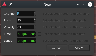 | Description | The note Edit dialog is only accessible from the right-click context menu only if a single MIDI note is selected, though it has checkboxes that suggest it was intended to work with multiple notes selected as well. I guess this feature is incomplete? | ||||
