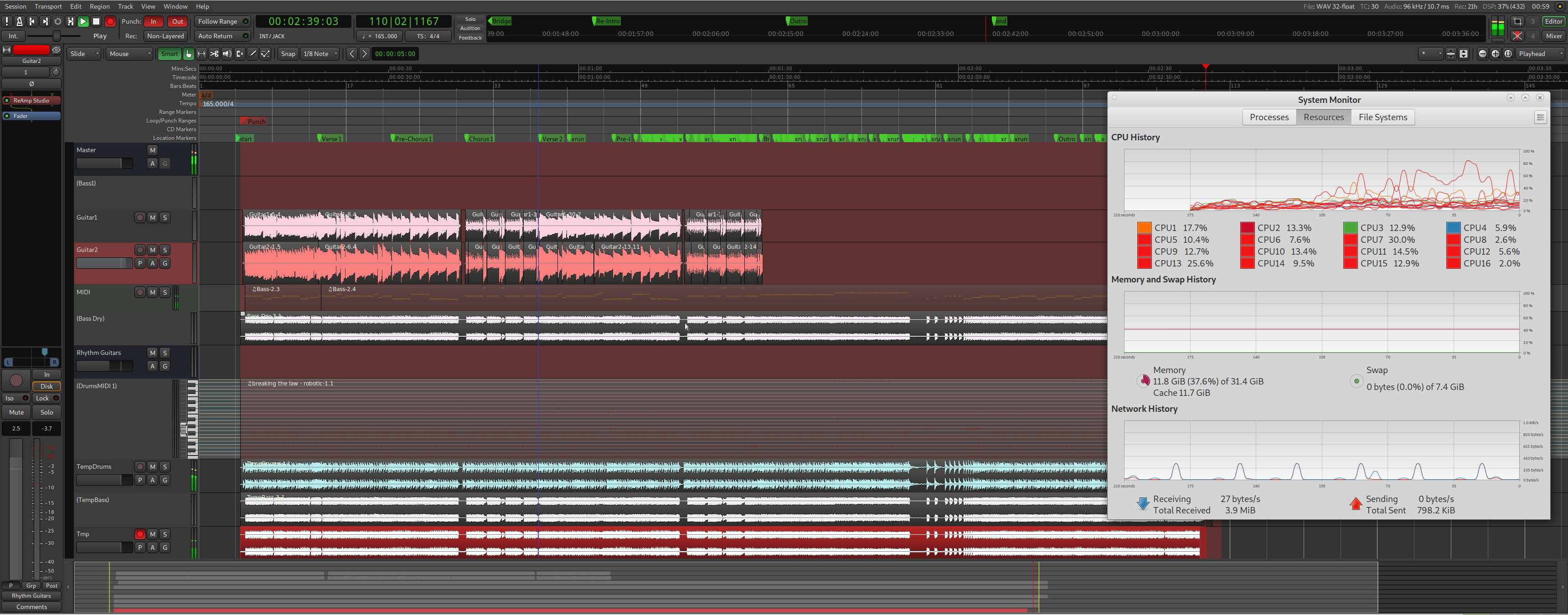 | Description | I am recording tracks using Ardour. Especially when I have the application take the whole screen (my monitor has a resolution of 3440x1440) the CPU usage gradually increases during recording. This makes the GUI become very stuttery and, more importantly, starts producing tons of xruns which completely kills the take. I've attached a screenshot where this can be seen. The recording started shortly after the CPU graph begins. In the beginning, everything is normal, but after a while, you can see CPU spikes appearing which also happen in sync with heaps of xruns. Now, in this song, lots of tracks are already disabled, I've seen the CPU spikes often going up to 100%, especially when the session gets more plugins. After stopping the recording, CPU usage will quickly go down to normal. This seems to only happen when recording, I can play back these tracks even with all Plugins activated without any issues. So far, I could mitigate the problem by reducing the Ardour window size to the smallest size it lets me (helps a lot!) and either disabling all unneeded tracks or render them to temporary tracks and then deactivating them so that the DSP load goes down (helps, but still need to reduce window size). However, even that does not completely mitigate the problem, the CPU spikes are still there, just usually not bad enough to start causing xruns. I can also see these CPU spiked on a completely new and empty Ardour session where all I do is insert a new Audio track and start recording. However, here they usually remain much lower and don't cause xruns, but they are definitely visible. | ||||