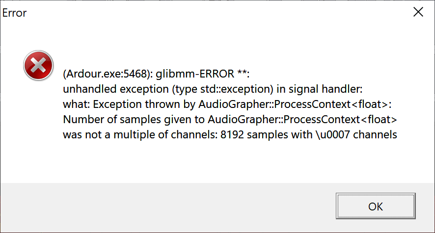 | Description | I have several 7-channel track in a project. They work perfectly fine. But when I try to run a loudness analysis on a clip, I get a crash to desktop with the following message (see attached image) : Exception thrown by AudioGrapher::ProcessContext <float> was not a multiple of channels: 8192 samples with \u0007 channels | ||||