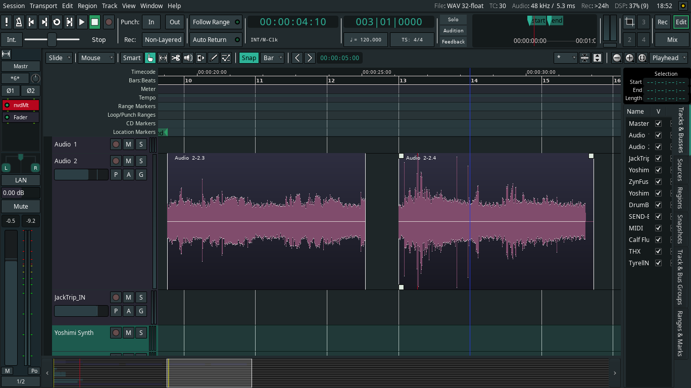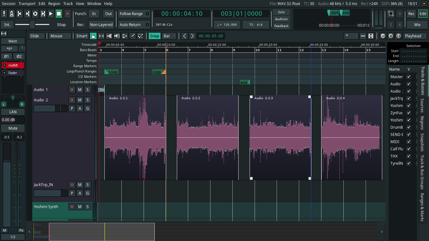 | Description | Reproduced using 6.6.203 running on Ubuntu Studio 20.04 AMD 64-bit. I am loop recording (mono). I'll record, say, 5 passes, which (apparently) works fine. But when I playback (as a loop) the audio for certain of the regions produced, it will produce audio only sporadically. I.e. some of the regions will work/sound as expected, but some (no pattern yet) will only produce sound (and mostly incomplete) intermittently. For example, it will only produce audio on the 4th time through the loop. I looked at the wav files in question, and they look intact (at least regarding the size). In addition, I move the problem region later in the track, and playing it, I get no sound. The visual element suggests there is a nice big waveform there. thanks! | ||||