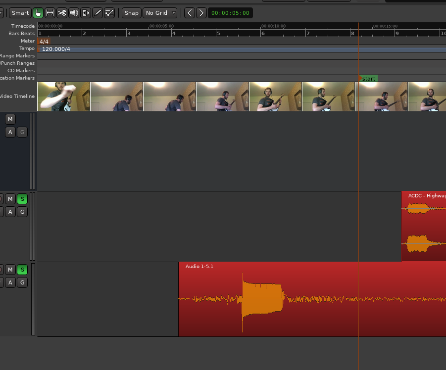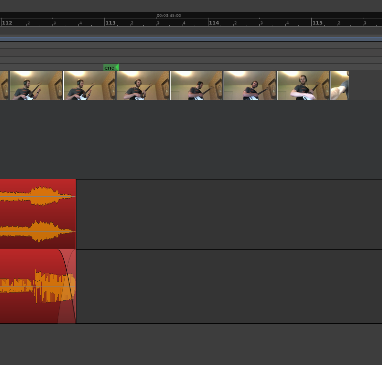 | Description | I have recorded myself in Ardour and taken a video via my phone, then synced the two within Ardour. Playback within Ardour and usage of the video monitor work flawlessly. However, when I try to export video, the bar never gets to the end, and when playing the file in an external player (mplayer) the video freezes near the end and warns: "Possibly bad interleaving detected." Through testing I've noticed: 1. If I extend END, the video freezing point extends a bit too. 2. If I extend END past the end of the Video Timeline, video export completely fails. 3. It doesn't seem to matter which output format I use. 4. If I open Ardour via the command line and tell the exporter to show me ffmpeg's output, nothing looks amiss there. 5. I don't think I'm having any resource exhaustion problems. I've attached some images to show how my tracks are set up. Thanks for any help you can offer. | ||||