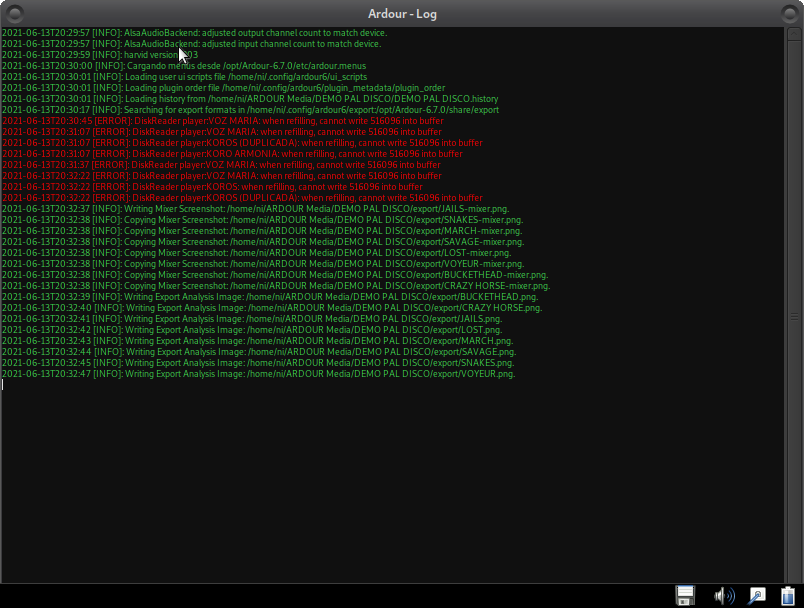 | Additional Information | Ardour log: 2021-06-13T20:29:57 [INFO]: AlsaAudioBackend: adjusted output channel count to match device. 2021-06-13T20:29:57 [INFO]: AlsaAudioBackend: adjusted input channel count to match device. 2021-06-13T20:29:59 [INFO]: harvid version: 803 2021-06-13T20:30:00 [INFO]: Cargando menĂºs desde /opt/Ardour-6.7.0/etc/ardour.menus 2021-06-13T20:30:01 [INFO]: Loading user ui scripts file /home/ni/.config/ardour6/ui_scripts 2021-06-13T20:30:01 [INFO]: Loading plugin order file /home/ni/.config/ardour6/plugin_metadata/plugin_order 2021-06-13T20:30:01 [INFO]: Loading history from /home/ni/ARDOUR Media/DEMO PAL DISCO/DEMO PAL DISCO.history 2021-06-13T20:30:17 [INFO]: Searching for export formats in /home/ni/.config/ardour6/export:/opt/Ardour-6.7.0/share/export 2021-06-13T20:30:45 [ERROR]: DiskReader player:VOZ MARIA: when refilling, cannot write 516096 into buffer 2021-06-13T20:31:07 [ERROR]: DiskReader player:VOZ MARIA: when refilling, cannot write 516096 into buffer 2021-06-13T20:31:07 [ERROR]: DiskReader player:KOROS (DUPLICADA): when refilling, cannot write 516096 into buffer 2021-06-13T20:31:07 [ERROR]: DiskReader player:KORO ARMONIA: when refilling, cannot write 516096 into buffer 2021-06-13T20:31:37 [ERROR]: DiskReader player:VOZ MARIA: when refilling, cannot write 516096 into buffer 2021-06-13T20:32:22 [ERROR]: DiskReader player:VOZ MARIA: when refilling, cannot write 516096 into buffer 2021-06-13T20:32:22 [ERROR]: DiskReader player:KOROS: when refilling, cannot write 516096 into buffer 2021-06-13T20:32:22 [ERROR]: DiskReader player:KOROS (DUPLICADA): when refilling, cannot write 516096 into buffer 2021-06-13T20:32:37 [INFO]: Writing Mixer Screenshot: /home/ni/ARDOUR Media/DEMO PAL DISCO/export/JAILS-mixer.png. 2021-06-13T20:32:38 [INFO]: Copying Mixer Screenshot: /home/ni/ARDOUR Media/DEMO PAL DISCO/export/SNAKES-mixer.png. 2021-06-13T20:32:38 [INFO]: Copying Mixer Screenshot: /home/ni/ARDOUR Media/DEMO PAL DISCO/export/MARCH-mixer.png. 2021-06-13T20:32:38 [INFO]: Copying Mixer Screenshot: /home/ni/ARDOUR Media/DEMO PAL DISCO/export/SAVAGE-mixer.png. 2021-06-13T20:32:38 [INFO]: Copying Mixer Screenshot: /home/ni/ARDOUR Media/DEMO PAL DISCO/export/LOST-mixer.png. 2021-06-13T20:32:38 [INFO]: Copying Mixer Screenshot: /home/ni/ARDOUR Media/DEMO PAL DISCO/export/VOYEUR-mixer.png. 2021-06-13T20:32:38 [INFO]: Copying Mixer Screenshot: /home/ni/ARDOUR Media/DEMO PAL DISCO/export/BUCKETHEAD-mixer.png. 2021-06-13T20:32:38 [INFO]: Copying Mixer Screenshot: /home/ni/ARDOUR Media/DEMO PAL DISCO/export/CRAZY HORSE-mixer.png. 2021-06-13T20:32:39 [INFO]: Writing Export Analysis Image: /home/ni/ARDOUR Media/DEMO PAL DISCO/export/BUCKETHEAD.png. 2021-06-13T20:32:40 [INFO]: Writing Export Analysis Image: /home/ni/ARDOUR Media/DEMO PAL DISCO/export/CRAZY HORSE.png. 2021-06-13T20:32:41 [INFO]: Writing Export Analysis Image: /home/ni/ARDOUR Media/DEMO PAL DISCO/export/JAILS.png. 2021-06-13T20:32:42 [INFO]: Writing Export Analysis Image: /home/ni/ARDOUR Media/DEMO PAL DISCO/export/LOST.png. 2021-06-13T20:32:43 [INFO]: Writing Export Analysis Image: /home/ni/ARDOUR Media/DEMO PAL DISCO/export/MARCH.png. 2021-06-13T20:32:44 [INFO]: Writing Export Analysis Image: /home/ni/ARDOUR Media/DEMO PAL DISCO/export/SAVAGE.png. 2021-06-13T20:32:45 [INFO]: Writing Export Analysis Image: /home/ni/ARDOUR Media/DEMO PAL DISCO/export/SNAKES.png. 2021-06-13T20:32:47 [INFO]: Writing Export Analysis Image: /home/ni/ARDOUR Media/DEMO PAL DISCO/export/VOYEUR.png. | ||||