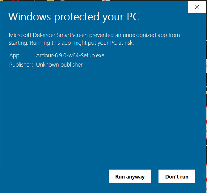 "unknown publisher" is expected. The application is not digitally signed by Microsoft. because we (ardour.org) do not pay Microsoft or any other entity for a windows certificate to sign the installer. Similar issue exists on macOS. We also do not pay the Apple tax. |