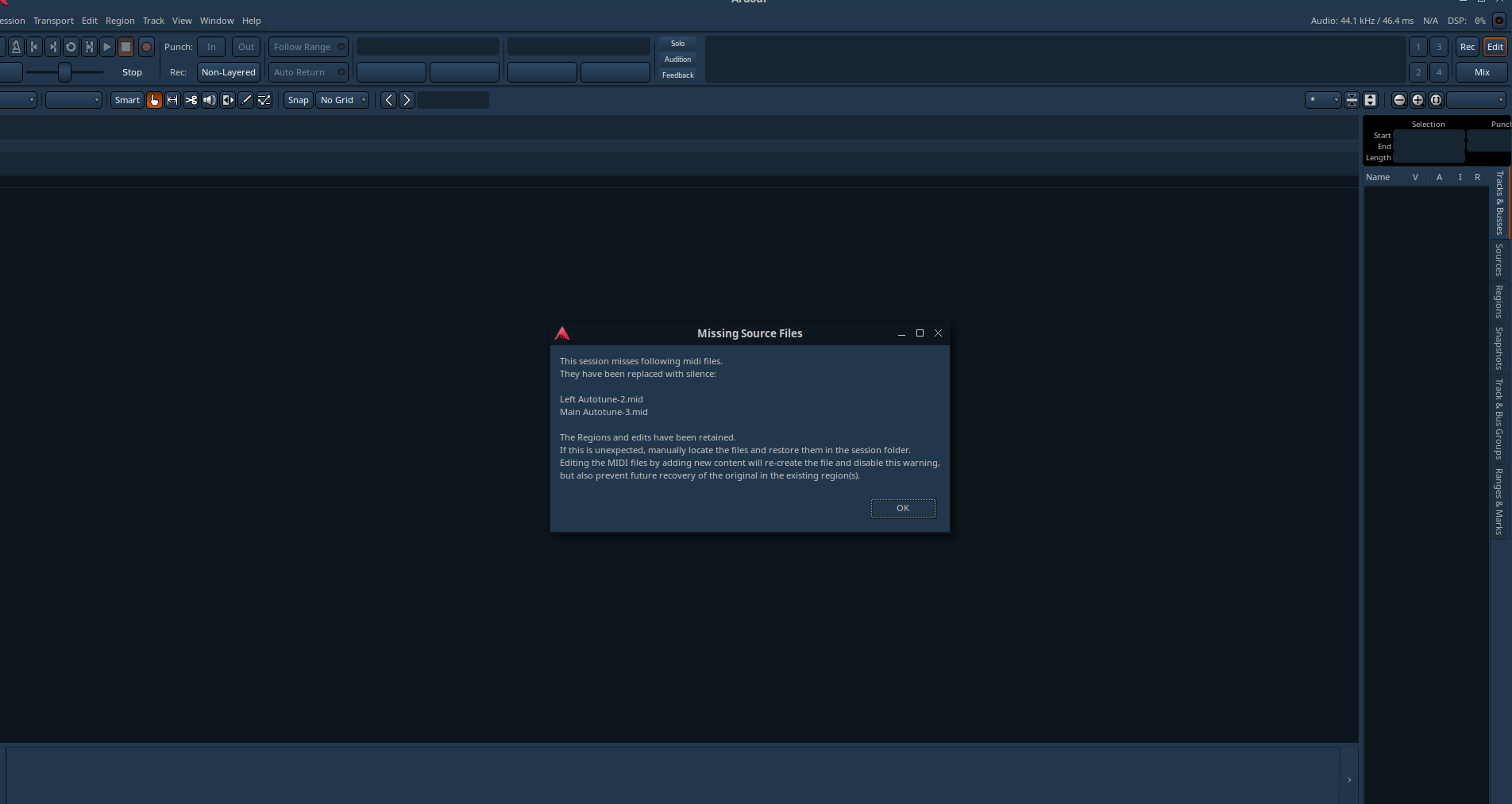 | Description | I am using Ardour 6.7.0 (rev 6.7) on Bandshed Records' AV Linux (my current OS is based on the outdated MX Linux 19), but this problem also occurred when I used to use Obarun Linux (based on Arch Linux, but with S6 instead of systemd) last year as well, so it's not OS exclusive. There is a small chance (small, but significant) that whenever I close and reopen a project, Ardour destroys a few MIDI files in my music projects. This became particularly problematic with me recently, as I had been manually tuning my vocal takes with x42 autotune and MIDI, and it was those autotune clips I lost, which I struggle to remember the notes for since they're not used the normal way. I have also tried to find it among the interchange and dead folders, but that failed, since the specific files I needed came from another project (I saved this project from another one to reuse the same mix template, and it seems I didn't clear the dead MIDI from the previous project). This bug is one of those ones which is infrequent enough for people to underreport it, and I know the famous musician and YouTuber unfa also has this problem and I, also a somewhat popular musician and YouTuber, am now speaking about this problem too. I would like to be able to find a solution to this problem that can allow it to be patched somehow. | ||||