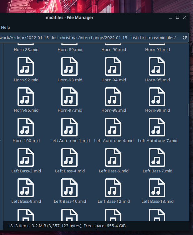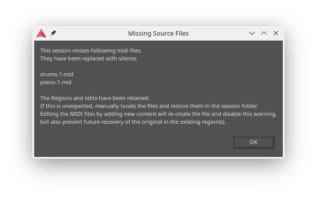 I can confirm I encountered this issue too today. After finishing up a project, some midi files were gone with the above described error message the next morning. The only thing different for me is that I had duplicated a previously existing session using Session -> Save as, and then I continued working on the new session. This new session was affected by the bug, but only midi files added after the duplication disappeared. Midi files that existed in the old session are still there in the new session. I ran a quick text search, and I'm finding instances of the old session's path still being referenced. I renamed "fiddling" to "fatal piano", and searching for fiddling showed the following: $ grep fatal\ piano/ -Eire fiddling fatal piano/fatal piano.ardour: <Option name="audio-search-path" value="/run/media/radi/Archives/Dropbox/Documents/Ardour/fiddling/interchange/fiddling/audiofiles"/> fatal piano/fatal piano.ardour.bak: <Option name="audio-search-path" value="/run/media/radi/Archives/Dropbox/Documents/Ardour/fiddling/interchange/fiddling/audiofiles"/> System: Linux 5.15.28-1-MANJARO 0000001 SMP PREEMPT Fri Mar 11 14:12:57 UTC 2022 x86_64 GNU/Linux |