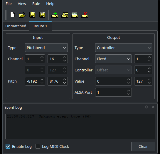 * To automate that with my faderport2 I connected the faderport in Jack with QMidiRoute to convert Pitchbend events to Controller events (see screenshot)