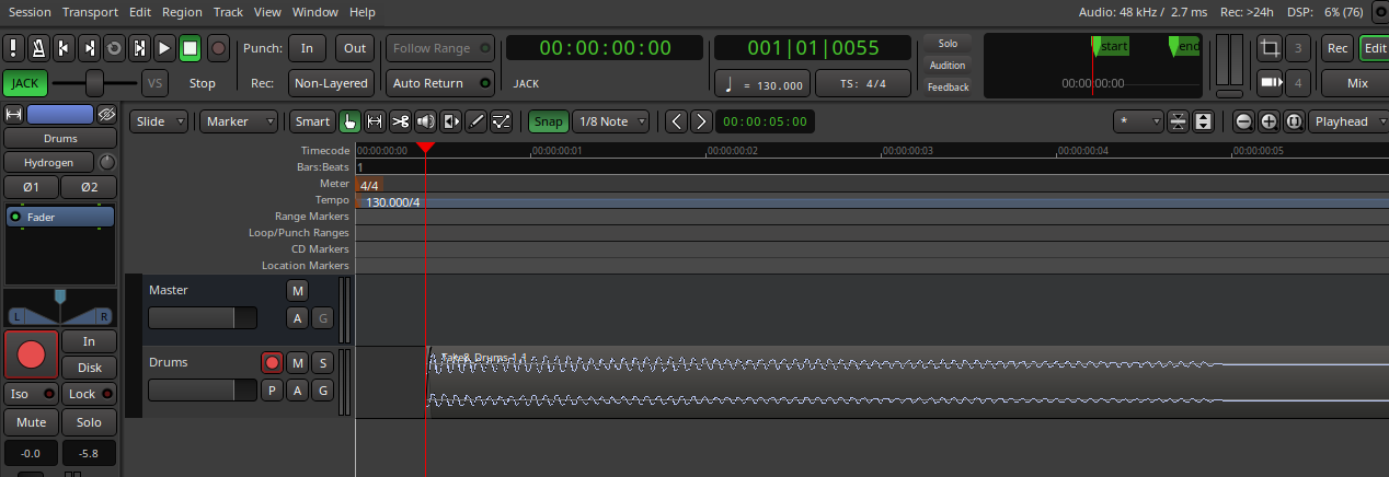 | Description | When recording a Hydrogen stereo drums track using Jack transport, the recording start is delayed by 55ms (see picture). | ||||