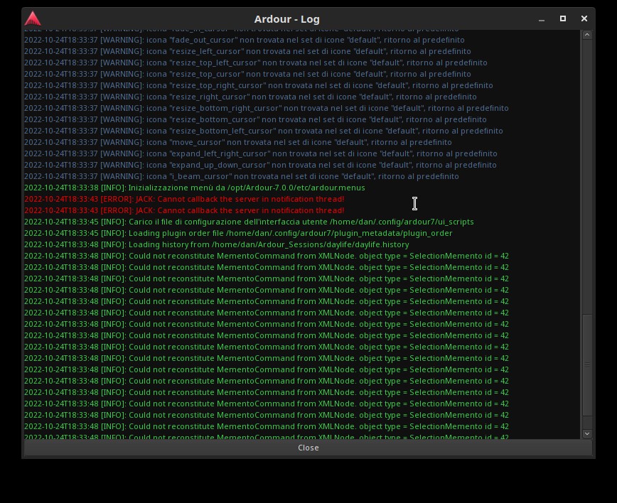 | Description | Since Ardour-7 (official binary) I see: [ERROR]: JACK: Cannot callback the server in notification thread! repeated few times in the log. Everything seems to work normally. openSUSE TW with Jack (not pipewire). | ||||