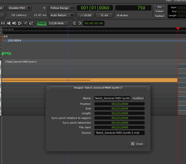 | Steps To Reproduce | 1. Make a new MIDI track. 2. Set the Grid Mode to "1/128 Note" and activate Snap. 3. Draw a new region 750 samples long (1/128 Note). 4. Maximize zoom to the drawn region. 5. Set the mouse to the Grab Mode and select the region. 6. Do the operation: Edit > Select > Set Range to Selected Regions - Ups!! - this makes the range 25 samples shorter than the selection. (7. Check the length of the rest area of the region - just cut (Ctrl+X) the formed range and look into the properties of the rest part of the region) | ||||