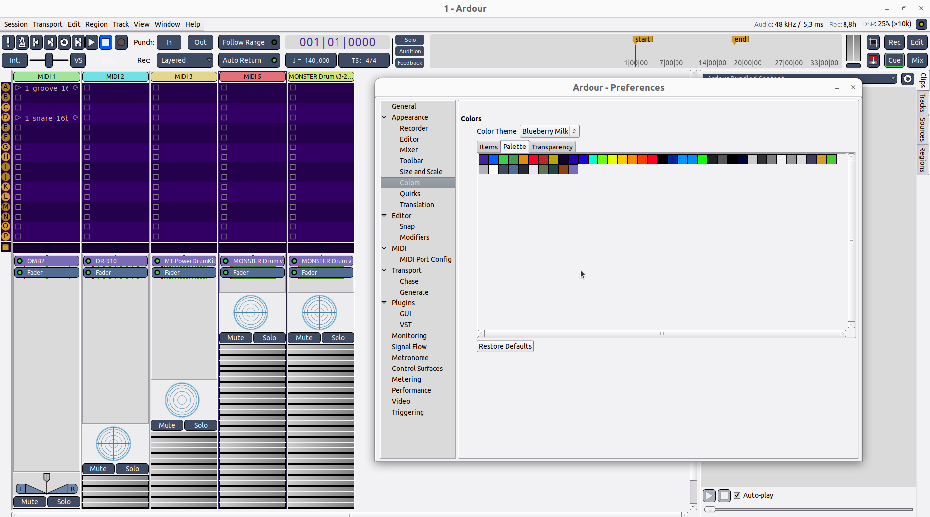 | Description | We have almost invisible light text on the light area in the clip launching window in Blueberry Milk theme. We have two ways to resolve a problem: 1. Make the text -> dark - that is impossible! - There are no items & aliases in the theme file. I've made "one color palette" - it has no result - the text stays the same. 2. Make the area -> dark - that is possible through the changing pallete color: Color name="theme:bg", BUT this involve almost all main items of the light theme. I've made a list of Aliases, where the "theme:bg" has a place: <ColorAlias name="arrange base" alias="theme:bg"/> <ColorAlias name="audio automation track fill" alias="theme:bg"/> <ColorAlias name="gtk_background" alias="theme:bg"/> <ColorAlias name="inactive group tab" alias="theme:bg"/> <ColorAlias name="meterbridge label: fill" alias="theme:bg"/> <ColorAlias name="midi device: fill active" alias="theme:bg"/> <ColorAlias name="monitor section processors toggle: fill" alias="theme:bg"/> <ColorAlias name="monitor section processors toggle: fill active" alias="theme:bg"/> <ColorAlias name="monitor section solo model: fill active" alias="theme:bg"/> <ColorAlias name="monitor section solo option: fill active" alias="theme:bg"/> <ColorAlias name="processor control knob" alias="theme:bg"/> <ColorAlias name="stereo panner rule" alias="theme:bg"/> <ColorAlias name="tracknumber label: fill" alias="theme:bg"/> - no one of them can control mentioned clip area. That mean we need a new SEPARATE Item for clip launching area. | ||||