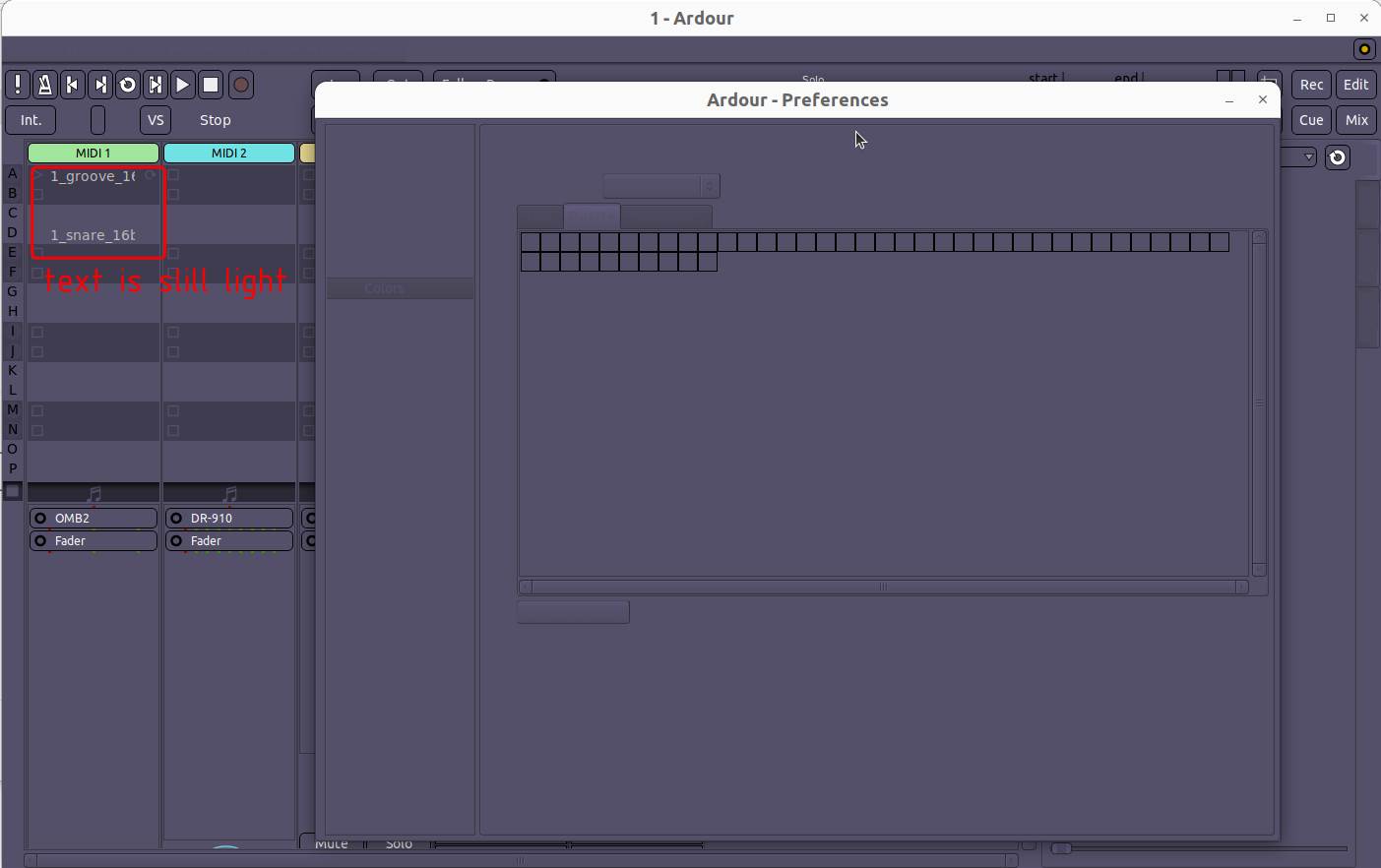 | Description | We have almost invisible light text on the light area in the clip launching window in Blueberry Milk theme. We have two ways to resolve a problem: 1. Make the text -> dark - that is impossible! - There are no items & aliases in the theme file. I've made "one color palette" - it has no result - the text stays the same. 2. Make the area -> dark - that is possible through the changing pallete color: Color name="theme:bg", BUT this involve almost all main items of the light theme. I've made a list of Aliases, where the "theme:bg" has a place: <ColorAlias name="arrange base" alias="theme:bg"/> <ColorAlias name="audio automation track fill" alias="theme:bg"/> <ColorAlias name="gtk_background" alias="theme:bg"/> <ColorAlias name="inactive group tab" alias="theme:bg"/> <ColorAlias name="meterbridge label: fill" alias="theme:bg"/> <ColorAlias name="midi device: fill active" alias="theme:bg"/> <ColorAlias name="monitor section processors toggle: fill" alias="theme:bg"/> <ColorAlias name="monitor section processors toggle: fill active" alias="theme:bg"/> <ColorAlias name="monitor section solo model: fill active" alias="theme:bg"/> <ColorAlias name="monitor section solo option: fill active" alias="theme:bg"/> <ColorAlias name="processor control knob" alias="theme:bg"/> <ColorAlias name="stereo panner rule" alias="theme:bg"/> <ColorAlias name="tracknumber label: fill" alias="theme:bg"/> - no one of them can control mentioned clip area. That mean we need a new SEPARATE Item for clip launching area. | ||||