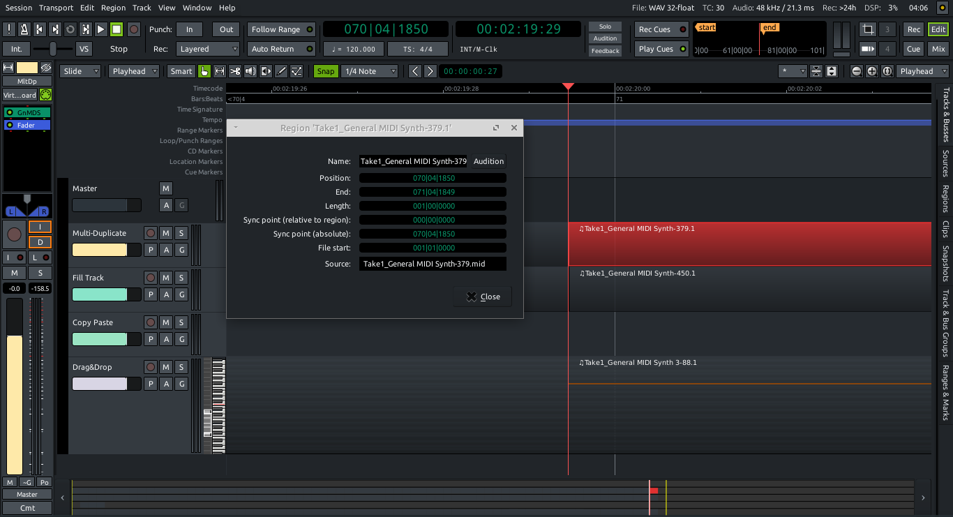 | Description | After copying a four-bar region with one quarter note C3 several times, the copied regions are shifted one unit to the left Multi-Duplicate Position End 1 001:01:0000 001:04:1919 2 001:04:1919 002:04:1918 3 002:04:1918 003:04:1917 4 003:04:1917 004:04:1916 Fill Track Position End 1 001:01:0000 001:04:1919 2 002:01:0000 002:04:1919 3 002:04:1919 003:04:1918 4 003:04:1918 004:04:1917 Same with Copy Paste and Drag&Drop | ||||