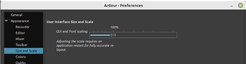 | Description | Seen on both Linux and Windows 10. Preferences > Appearance > Size and Scale > GUI and Font scaling The currently selected scaling value isn't obvious if it's not 100%. There's only one value above the slider, i.e. 100%. Possible suggestions: * Put other static values above the slider, although they probably won't all fit. * Have the currently selected value displayed (and it dynamically changes as the slider is moved). * Remove the slider and just allow the user to type in the value or select from a list of values. | ||||