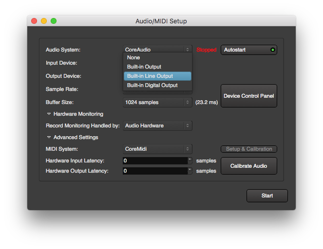 The problem arises when I do stop the engine, the start it anew after having swapped from Headphones to line out (to listen on speakers rather than headphones). Attached is a screenshot of the System Preferences listing of "Headphones" which are plugged into the jack in the front of my 2010 Mac Pro. |
