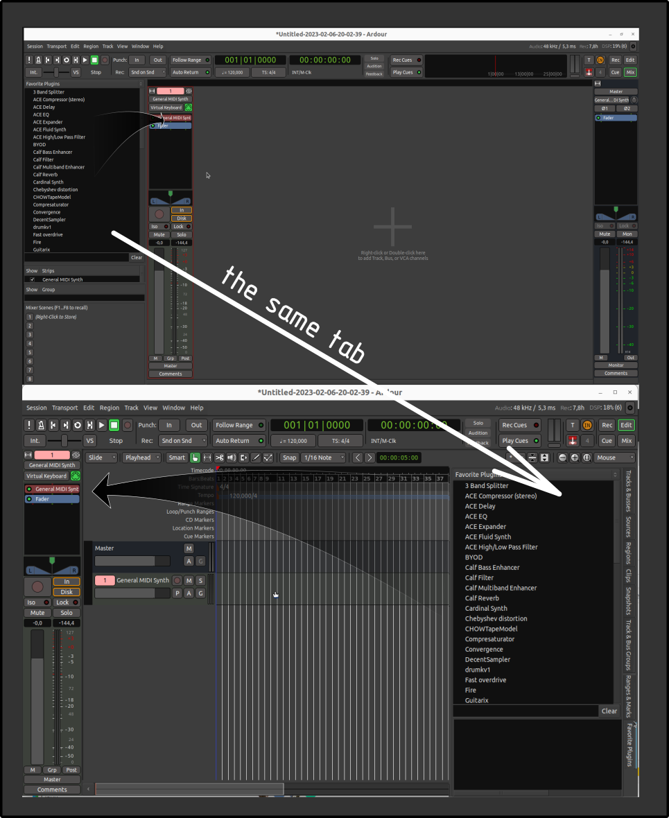 This feature request is absolutely not so important, it was just my thought! For my personal taste&needs - Ardour is already good featured - just only bugs polishing could make the DAW super-cool for me! About "reach the editor-mixer" - it is the same as if we want to reach from the mixer favorite plugins list to the Master Bus stripe in the Mixer window.. But you are the master, no problem!)) My deal is to propose.. And also thanks for the response & dialog! Good&creative mode, x42! :)) |