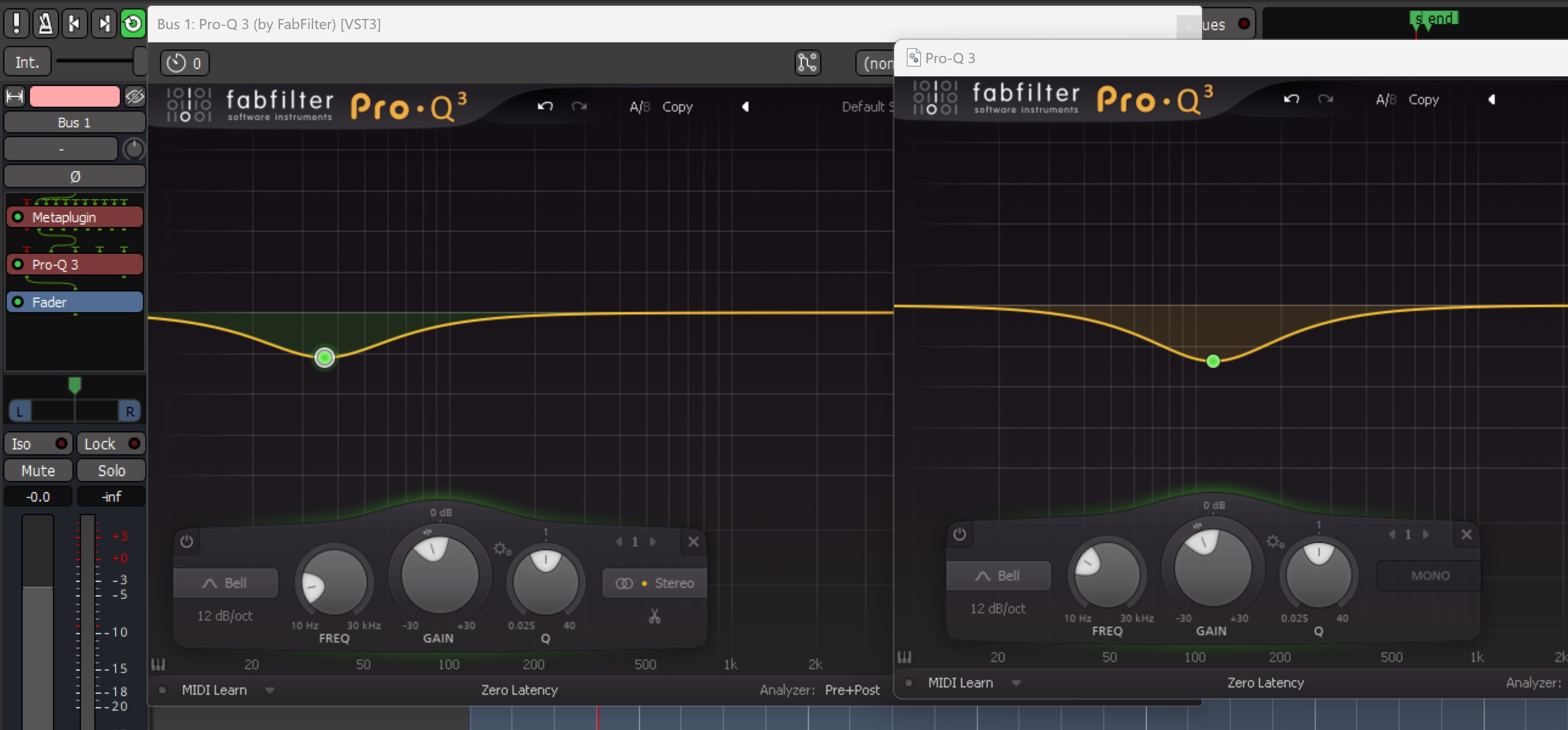 | Description | When using Pro-Q on a mono track or bus the UI continues to provide stereo options. The bx_console_9000 has similar functionality with different UI's for mono and stereo, and works correctly in Ardour. I've included a screenshot using Pro-Q forced to mono within Metaplugin to show the correct interface. | ||||