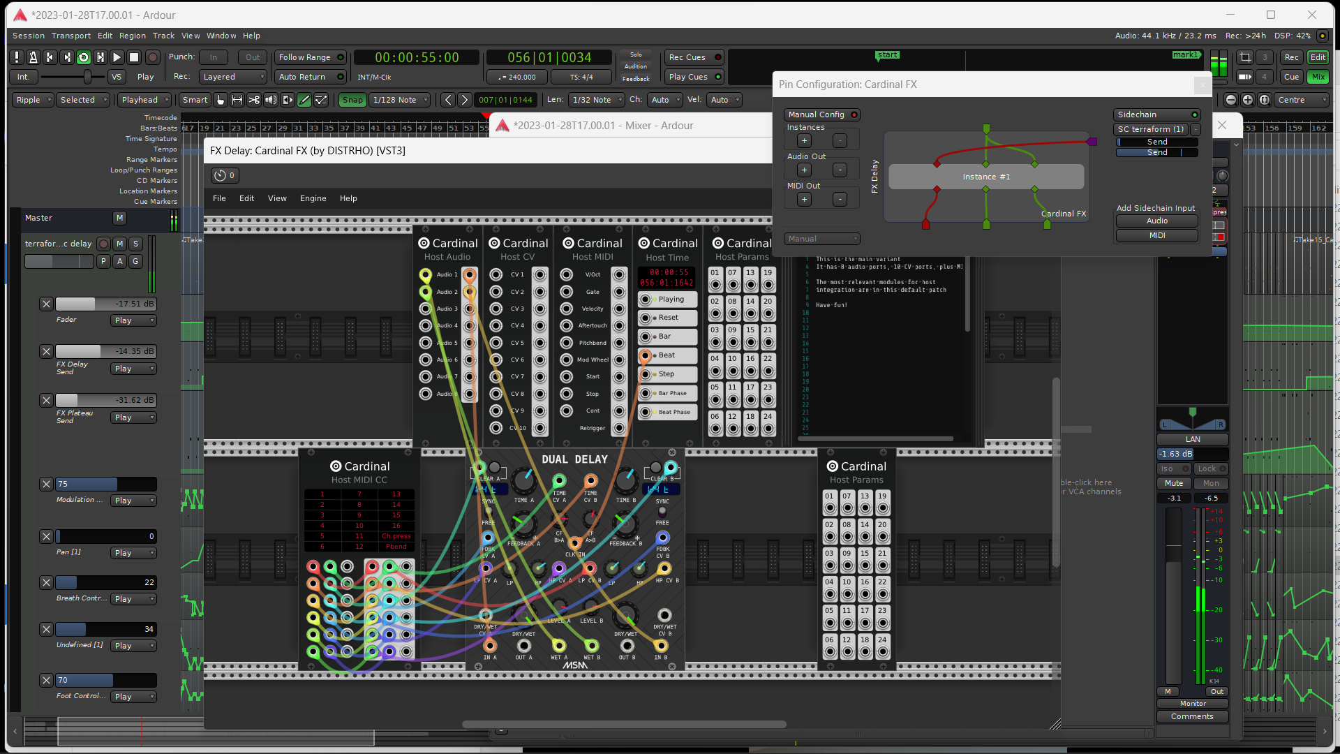 | Description | I have achieved this in the past in Ardour using sidechaining from midi instrument tracks to control Cardinal FX plugins. I think it would be nice to have CC editing for Busses (with editable names per parameter) so parameters for shared FX can be altered as the song plays without having to come via sidechains. The picture shows how I reckon I have achieved this in the past (pre current nightly version of Ardour I'm using) via sidechaining. I'm thinking it might make sense for the busses to be able to send CC data directly without a sidechain. | ||||
