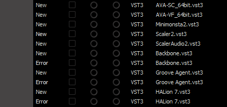 So I've continued to look at this problem: 1) Uninstalled Mixbus32C-7, Mixbuis32C-8 and Ardour 2) Attempted to clean up old directories that hold the VST cache type stuff along with anything else that looked like it was left over. The only thing left on purpose was session files. 3) Purchased the full version of what Steinberg calls 'Absolute 6' which includes HALion 7 and a bunch of other stuff. All of this works fine in stand alone mode on the Windows desktop. 4) Installed Mixbus32C-8 and run it for the first time. It indexes but does not scan the plugins. In the Mixbus8->plugin_metadata directory there is a scan_log file which I will attach. However at this point it's alredy complaining about an "Invalid Module Path " <PluginScanLogEntry type="VST3" path="C:\Program Files\Common Files\VST3\Minimonsta2.vst3" scan-log="" scan-result="1"/> <PluginScanLogEntry type="VST3" path="C:\Program Files\Common Files\VST3\Scaler2\Scaler2.vst3" scan-log="" scan-result="1"/> <PluginScanLogEntry type="VST3" path="C:\Program Files\Common Files\VST3\Scaler2\ScalerAudio2.vst3" scan-log="" scan-result="1"/> <PluginScanLogEntry type="VST3" path="C:\Program Files\Common Files\VST3\Steinberg\Backbone.vst3" scan-log="" scan-result="1"/> <PluginScanLogEntry type="VST3" path="C:\Program Files\Common Files\VST3\Steinberg\Backbone.vst3\Contents\x86_64-win\Backbone.vst3" scan-log="Invalid Module Path " scan-result="4"/> <PluginScanLogEntry type="VST3" path="C:\Program Files\Common Files\VST3\Steinberg\Groove Agent.vst3" scan-log="" scan-result="1"/> <PluginScanLogEntry type="VST3" path="C:\Program Files\Common Files\VST3\Steinberg\Groove Agent.vst3\Contents\x86_64-win\Groove Agent.vst3" scan-log="Invalid Module Path " scan-result="4"/> In the screenshot attached below you can see the 'Error' listed for a couple of the new Steinberg VST3's |