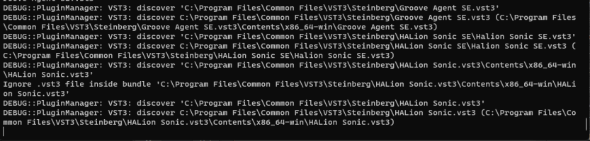 What you describe is exactly what I would excpect. except that Ardour should not hang. 1. Create a blacklist entry 2. Scan the plugin 3. Remove the blacklist entry Since you kill Ardour at Step 2, the plugin remains backlisted. Also "bundle="C:\Program Files\Common Files\VST3\Steinberg\HALion 7.vst3" module="C:\Program Files\Common Files\VST3\Steinberg\HALion 7.vst3\Contents\x86_64-win\HALion 7.vst3" now looks correct. The bundle is correctly detected. Now the big question is: Does the VST3 scanner also hang when you launch it manually, or does it only happen if you use the GUI. Please run "C:\Program Files\Ardour7\bin\ardour-vst3-scanner.exe" -v -f "C:\Program Files\Common Files\VST3\Steinberg\HALion 7.vst3" |