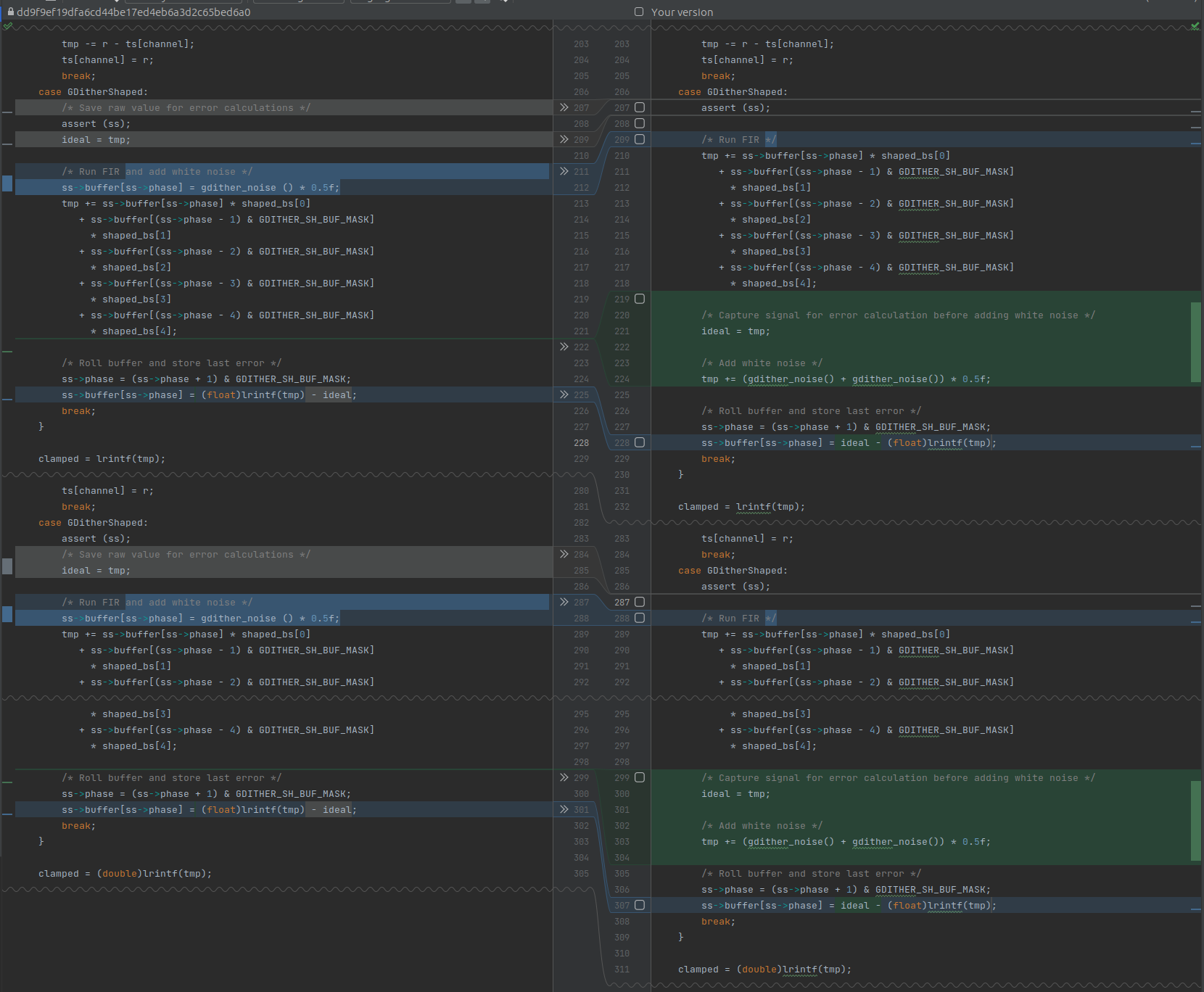 While this ostensibly fixes the issue, it does not seem to be right. With this change "ideal" is really the error. The key difference in your patch seems to be to use triangular shaped noise (gdither_noise() + gdither_noise()) * 0.5f; It has been a while since I've looked into shaped dithering, I'll have to refresh my memory. |