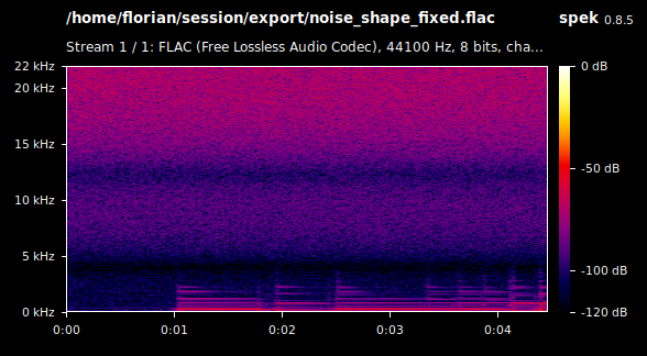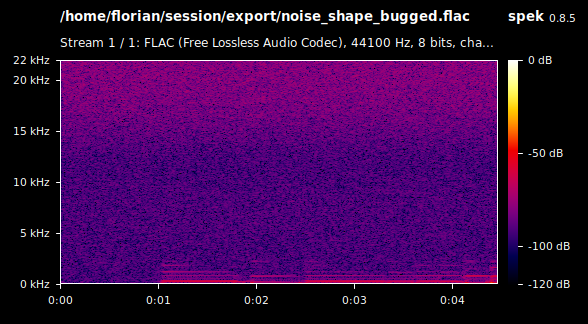 | Description | The current noise shaping algorithm doesn't work as it doesn't use the error value within the error feedback function, because it always gets overridden by noise before any usage. I fixed the implementation by looking at Audacitys dither code which is ironically based on Ardours code. I attached 2 short 8 bit FLAC example exports for illustration, one before and one after the bugfix. Furthermore I attached a spectrogram for each of the files. I uploaded the fixed cpp file which I used to generate the "fixed" FLAC. Furthermore calling gdither_noise() twice gave me the very best results, much better than using the same logic from GDitherTri, but feel free to make you own experiments. | ||||