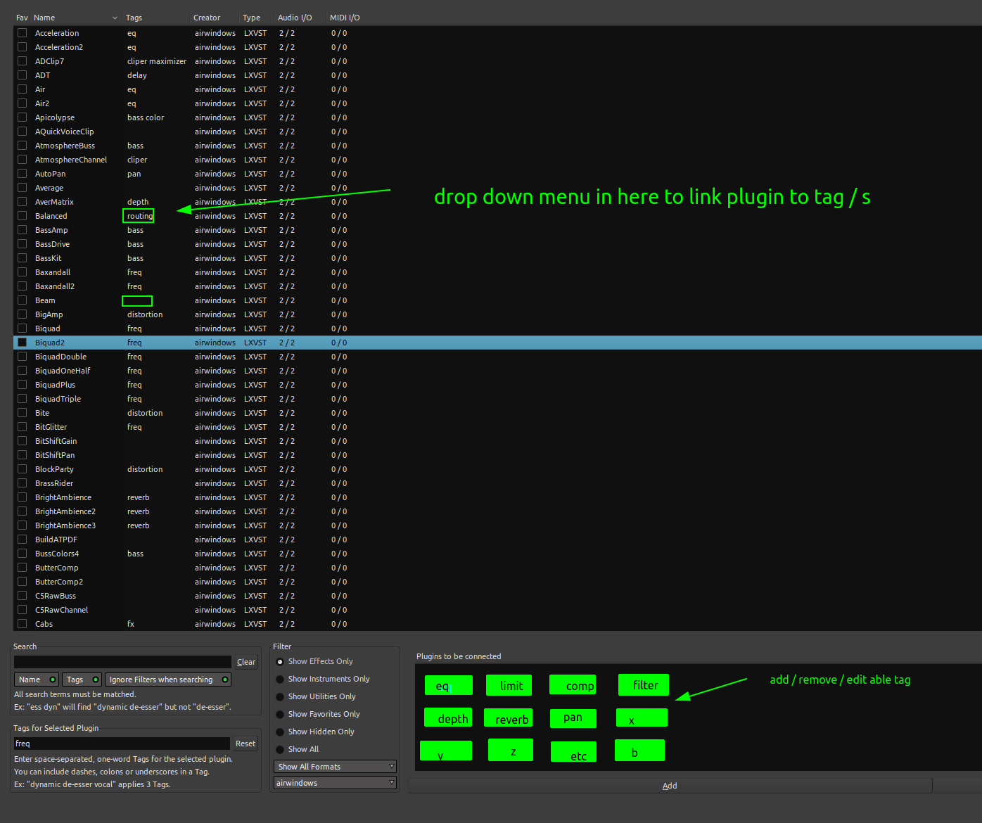 | Description | traditionally if you decide to reorder / organize you plugin with tags in ardour you should edit plugin tag one by one and to organize individual tag you need modify it from plugins are linked to it in text format why not create button for tag/s and dropdown menu to un/link like this in bellow screenshot | ||||