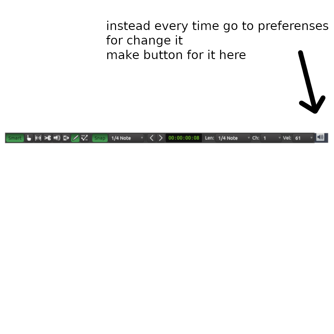 | Description | instead every time going to preferences page for change this option "sound MIDI note as they are selected in editor" make button for it pay attention to screenshot | ||||