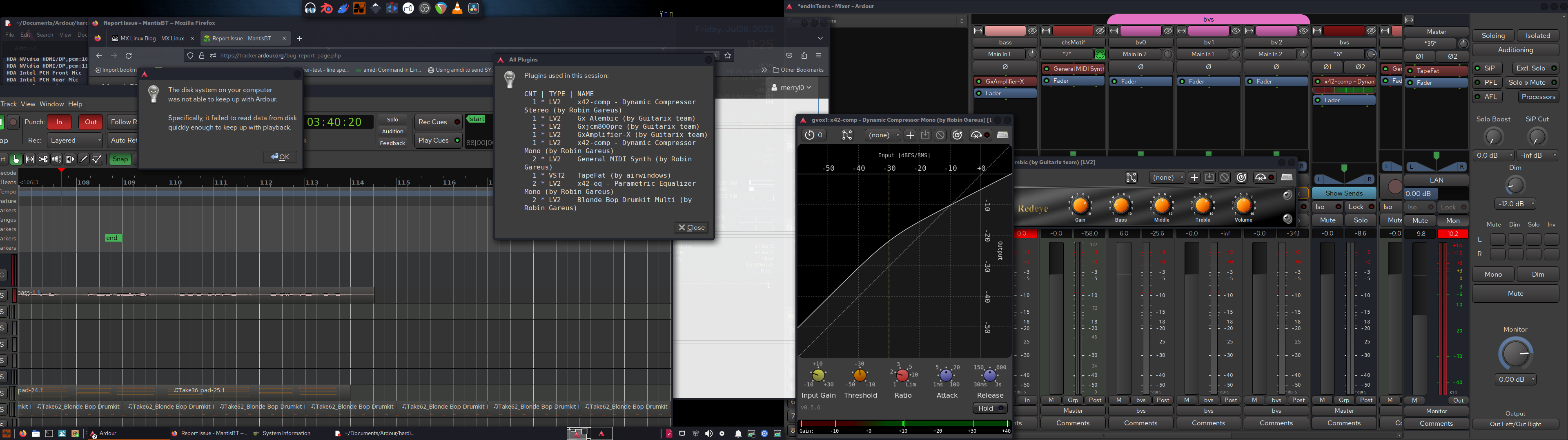 | Description | I keep getting the disk too slow error message on fairly basic sessions e.g 3 midi instruments 5 mono audio tracks a few plugins Changing the buffer size doesn't seem to help I've attached a screenshot, and the hardware report for my computer. below is a link to the xsession-errors file Can you tell me is the disk (SanDisk SD6SB2M5 SSD) really too slow for this kind of work? Many thanks | ||||