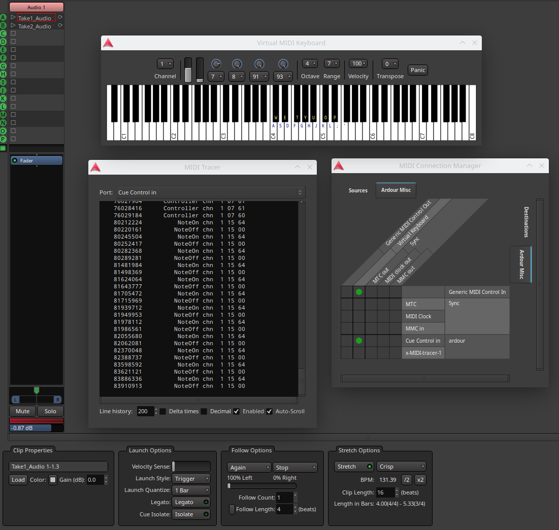 | Description | I cannot get midi input to trigger clip playback from the cue. I have tried using Virtual MIDI keyboard and Akai MPKMini. Using either of these keyboards I can play to synthesizer tracks. I can also map midi controls to faders, and then I can control faders from midi keyboard. But trying to get "midi learn" function to work from the Cue view never works. In MIDI connection manager I have connected the keyboard to "Cue Control In". In MIDI tracer I can see the midi keyboard inputs displayed in the "Cue Control In". The documentation https://manual.ardour.org/cue/setting-up-cues/playing-back-the-cues/ says that this should work. Have I mis-configured or missed a step? Or is it broken? Thanks | ||||