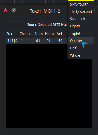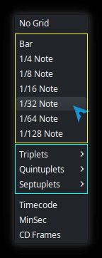 The Note Length dropdown in the List Editor is different from the Grid Mode dropdown (highlighted in Yellow) The List Editor uses only words to describe note length while the Grid Mode dropdown uses fractions and words. Could it be the an idea to make have the same entries, for consistency? Perhaps the List Editor could include Triplets, Quintuplets and Septuplets (highlighted in Cyan), just like the Grid Mode dropdown does? A bit curious why these are not the same. It feels like these functions does not reference the same code? Consistency is the point of this comment. Other than that, I'm not sure. |