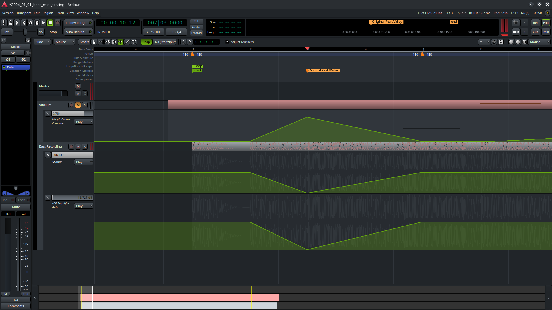 Attached are two more screenshots, one before applying a midtwist and the other after. In both, there are three automation lanes. The track labeled Vitalium is a midi track and has automation on one of the track's plugins. The track labeled Bass Recording is an audio track and has two automation lanes, one on the panning control (azimuth) and the second automating the gain parameter of the ace gain plugin. Before the midtwist, there is a peak or a valley aligned with the location marker labeled "Original Peak/Valley" in all three automation lanes. Also, the transport is initially located at the same spot. After the midtwist, the audio track's automation points remain aligned with the transport where they were located originally. The midi track's automation lane however has shifted to follow the new twisted grid. The audio behavior is correct as expected. The location marker following the twist also is correct as expected. The midi behavior definitely feels like a bug, as now the midi notes are decoupled from the midi automation. (Not visible in these latest two screenshots is the fact that the midi notes themselves do not move when the grid is twisted.) |