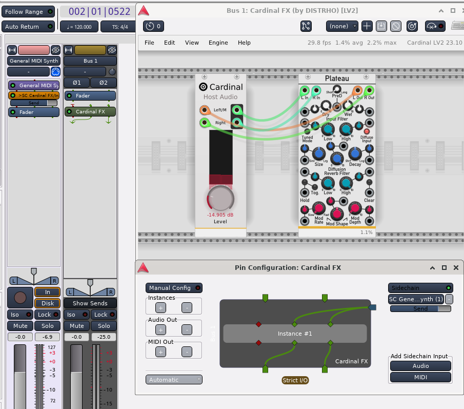 I am not able to reproduce. I started cardinal, added a plateau module, sent output from a midi track to the cardinal plugin via sidechain. After that, I was able to open the cardinal FX GUI (see screen shot). Should I be doing something else to reproduce? I'm using the following versions: * Arch Linux * Cardinal 23.10 * Ardour 8.1 |