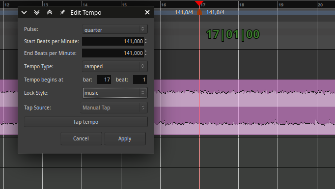 | Additional Information | No amount of reselecting ramped, modifier keys or incantations seem to change the behaviour. I even tried to change the default in the code, which works visually but not as a setting...the problem is obviously a little deeper than my code-monkey abilities can deal with. When I have managed to maintain a ramp, sometimes it has decided to do weird stuff like a reverse-ramp (ie, the tempo at the beginning gets higher than the target tempo, which could be useful in some situations, but is a bit counterintuitive). As a side-note, It is also not clear if the ramped/constant setting applies: 1. from the mark onwards 2. up to the mark 3. in and out of the mark | ||||