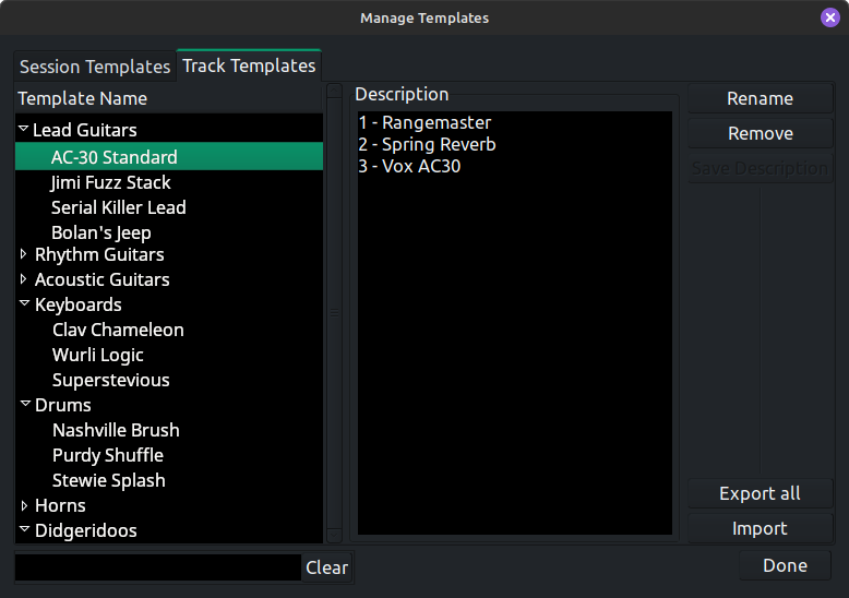 I like the idea! Under your Track Folders Mockup, I think an additional tab for "Buss Templates" would be helpful. This may be getting to be too much but, maybe a tab for 'Ardour Open Source Templates' that would have templates using only open source plugins, and submitted to Github to get included with Ardour. Another suggestion would be an "Online Templates" tab, where users can share templates, but I could see that getting too messy. Just some thoughts...... |