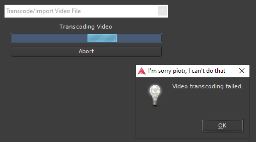 | Steps To Reproduce | 1. Create session with a name that contain diacritic letter (1 char Ä is enough) 2. Open video, import it with transcoding 3. Error should come out | ||||
