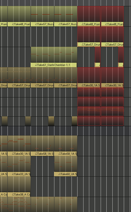 This also happens if the midi parts are in one group. See picture: the red midi parts are a copy of the yellow ones on the left side. The parts are al in gropus to make an arrangement with them. As you can see: in the red copied group, the gaps between the midi parts collapsed. |