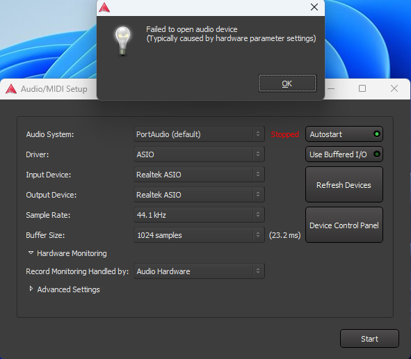 @x42. I will have to slightly agree with Phantom and say that Ardour/Mixbus is the least user-friendly DAW for sound-card setup in Windows. Other DAW's do not need intervention to work on Windows. I had to put a little time and effort into making Ardour work well with Windows. As for the cause of what is making Ardour behave this way, I have no Idea . Maybe PortAudio is not requesting proper usage for the soundcard in windows ? BitWig, Cubase, and ProTools have not needed any special attention, and work right after install. Ardour Linux works fantastic!