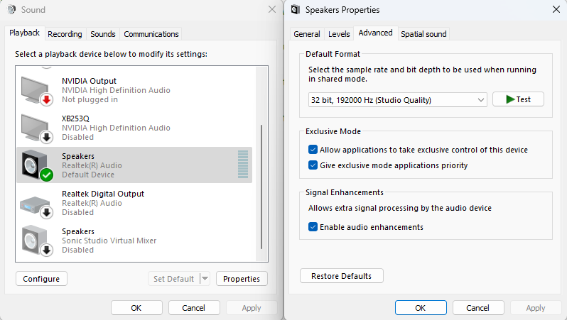 @Phantom, did you disable both the playback and record devices ? Sorry, I did not mention disabling the record devices in my previous post. If you did disable both playback and record devices in Windows, another setting you can try is the "Allow applications to take Exclusive Control" option. Check or Uncheck it and give that a try and see if that works. Just make sure to set that back to what it was if it does not work. As far as the MME Drivers not working , a suggestion would be to make sure your bit-depth is correct. I don't know the proper setting for your system, if it should be 16 or 24 bit. The Sample rate also has to match in Ardour as well for the MME drivers to work. I do know that certain ASIO drivers from other manufactures can also be a little glitchy. The Windows Generic ASIO driver is absolutely horrible on my system. Constant Crashes no matter what DAW is used. ASIO4ALL may work for you, but you may get a little bit higher than desirable latency. My system can run at about 5-10ms latency, but with ASIO4ALL, the latency gets worse, about 50-60ms. https://asio4all.org Just curious, what shows up when you select 'Device Control Panel' on the Ardour Setup ? What kind of audio work are you planning to do with Ardour ? Recording Live Instruments ? Using VST Instruments ? Do you only have the onboard audio to work with ? |